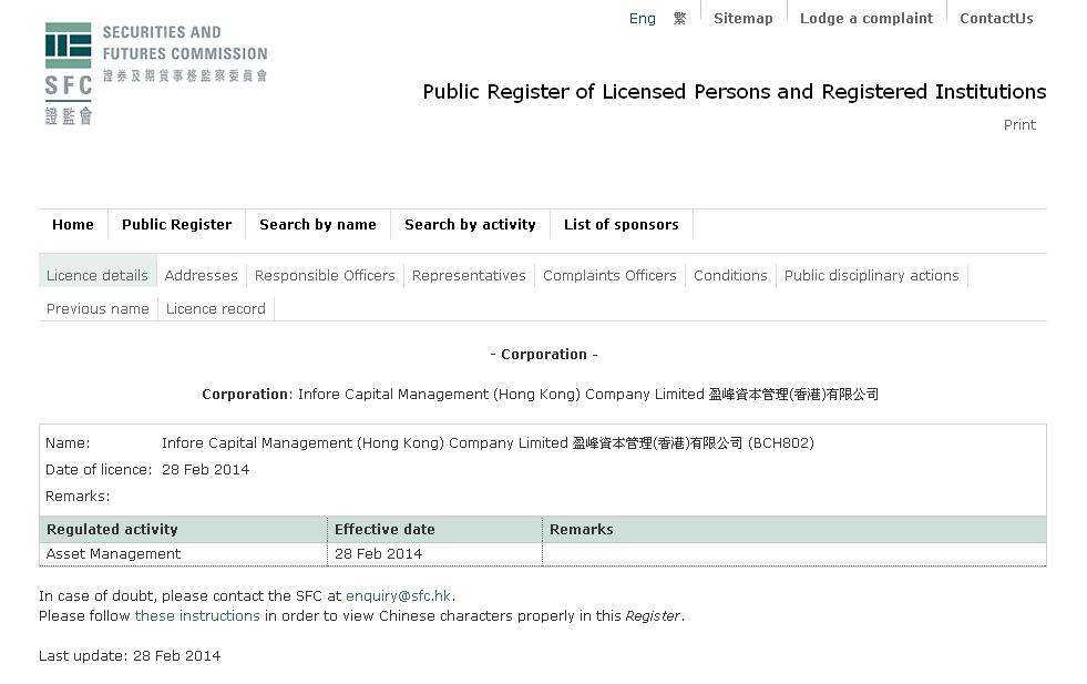 Infore Investment Management ( Hong Kong ) Co.,Ltd is granted the Hong Kong securities regulatory commission No. 9 licence